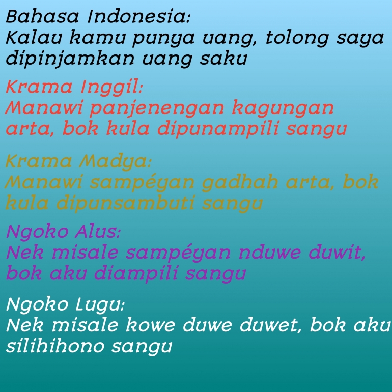 Untuk meminta maaf kepada orang yang lebih tua seperti nenek kakek ayah dan ibu sebaiknya kita menggunakan bahasa krama. Contoh Surat Cinta Bahasa Jawa Ngoko Perbedaan antara tingkat tutur dalam bahasa jawa utamanya adalah pada kosa kata serta imbuhan yang digunakan. Bahasa Jawa merupakan bahasa yang digunakan penduduk bersuku Jawa yang mayoritas.